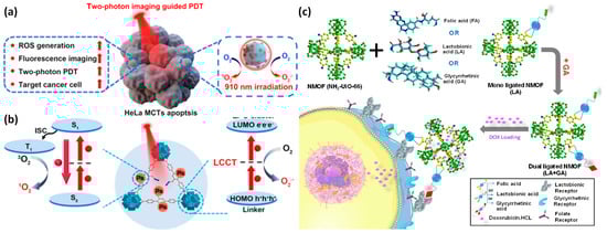 (a) Schematic illustration displaying the PDT guided by two-photon fluorescence imaging, the target cancer cell, and the light-induced ROS creation; (b) mechanisms of ROS created by PCN-58-Ps-HA by light irradiation of two-photon; (c) drug delivery systems using functionalized Zr-based NMFOs (NH2-UiO-66) for the targeted therapy of hepatocellular cancer are represented systematically. Reproduced with permission from references [,].