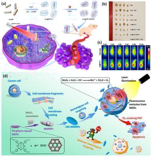 (a) A diagram of the core–shell Au@ZIF-8/DOX synthesis process for in vivo chemo-photothermal cancer treatment; (b) intravenous injections of Au@ZIF-8 or PBS solution followed by in vivo infrared thermal imaging of MCF-7 tumor-bearing mice following activation with a 1 W/cm2 808 nm laser for 10 min; (c) a characteristic image of tumors removed from mice treated in each group; (d) the nanostructure is made up of a cancerous cells membrane layer and a metal–organic framework core coated in MnO2 nanosheets for MRI and fluorescence dual-mode imaging, homologous targeting, and photodynamic therapy for the diagnosis and treatment of cancer cells. Reproduced with permission from references [,].