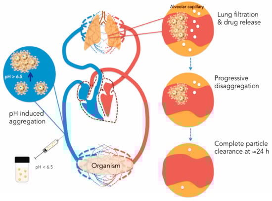 To target the lung, an iron-based biodegradable MOF that exhibits pH-responsive as well as reversible aggregating activity was created. Within twenty-four hours, the nanoparticles were enabled to autonomously aggregate at the pulmonary capillaries and then disaggregate again. Reproduced with permission []. Copyright 2021, Wiley-VCH Verlag GmbH & Co. KGaA, Weinheim.