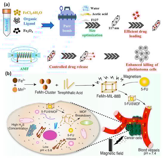 (a) F127 copolymer was used as a stabilizing substance during the synthesis of MOF Fe3O4 NPs with MIL-88B-NH2 structures, and these nanoparticles were used to deliver drugs using an alternating magnetic field and localized heating effect; (b) a preassembled Fe2Mn(3-O) cluster was used to create an FeMn-based ferromagnetic MOF that controlled drug release by dual stimulation, ferromagnetic nature, and low toxicity. Reproduced with permission from references [,].