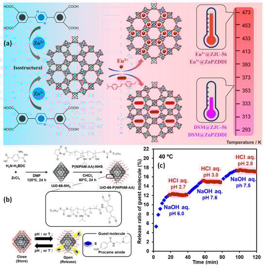(a) Illustration of the fabrication of nanocomposites made from DSM@MOFs and Eu3+@MOFs for dual-emitting sensor nanomaterial; (b) schematic illustration for making an MOF that is tethered by P(NIPAM-AA) (UiO-66-P(NIPAM-AA)) and released under regulated conditions utilizing UiO-66-P (NIPAM-AA); (c) procaine amide’s sequential release and halt exhibited by UiO-66-P/NIPAM-AA in water are time-dependent and affected by pH. Reproduced with permission from references [,].