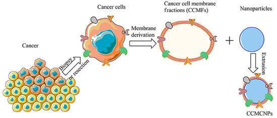 Diagram depicting the processes required for the synthesis of tumor cell membrane-coated nanomaterials. Reproduced with permission from []. Copyright 2020 Frontiers in Oncology.