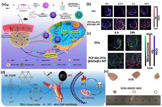 (a) Synthetic approach and graphical depiction of PCP-Mn-DTA@GOx@1-MT nanomaterial for combination starvation, immunotherapy, and oxidation; (b) hemoglobin (HB) and oxygenated hemoglobin (HBO2) photoacoustic recordings; (c) melanin signals in mouse tumor sites following intratumoral injecting with PCP-Mn-DTA@GOx@1-MT and GOx for multiple time frames; (d) a plan for creating MOF-SNO nanocomposite, releasing nitric oxide when exposed to NIR light, and using photothermal therapy; (e) pictures of the tumors in each group following treatment. Reproduced with permission from references [,].