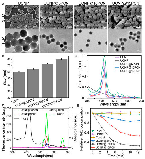 Characterization of UCNP@nPCN nanoparticles. (A) Electron microscope images of different nanoparticles. (B) Size of different nanoparticles by DLS. (C) UV-vis absorption spectrum of different nanoparticles. (D) UV-vis absorption spectrum of PCN nanoparticles and fluorescence spectrum of different nanoparticles including UCNP, UCNP@5PCN, UCNP@10PCN UCNP@15PCN. (E) The detection of ROS via RNO probe. The concentration of ROS is inversely proportional to the concentration of RNO.