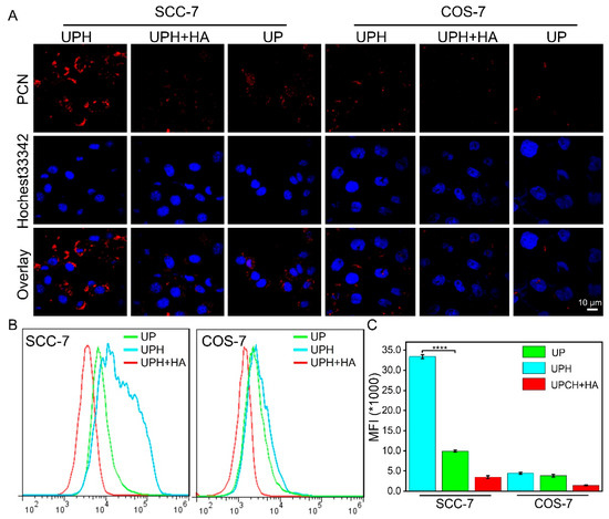 Considering the protective function of HA to avoid metabolic clearance in long blood circulation, the strong affinity to the CD44 receptors overexpressed on the surface of many tumor cells, and the easy degradation by hyaluronidase (HAase) in the cell to release payload [30], HA was coated on the surface of UCNP@10PCN to serve as an active targeting ligand for the enhanced endocytosis of the nanoparticles. By using coordination and electrostatic interactions, we successfully conjugated HA on the surface of UCNP@10PCN to form the UCNP@10PCN@HA (UPH) nanoparticles, which was confirmed by dynamic light scattering and infrared spectroscopy (Figures S5 and S6). In addition, the UPH nanoparticles showed a good stability in the PBS buffer (Figure S7). To verify the enzyme responsiveness of the UPH nanoparticles, we co-incubated the UPH material with hyaluronidase. It was clear that the degradation of enzymes accelerated the production of the ROS (Figure S8). This may be attributed to the consumption of the ROS by hyaluronidase. Subsequently, we conducted an endocytosis experiment against tumor cells (SCC-7, known for highly abundant CD44 receptors) and normal cells (COS-7). As shown in Figure 2A, a larger area of red fluorescence was observed in the cytoplasm of the SCC-7 cells compared with that of the COS-7 cells, demonstrating the higher uptake of the UPH nanoparticles by tumor cells. To further demonstrate HA-mediated endocytosis, the mixture of HA and UPH was co-incubated with cells. Due to the competition mechanism in the presence of HA, the uptake of the UPH nanoparticles was drastically decreased. The phenomenon indicated that the high affinity of HA for cancer cells contributed to the endocytosis of the nanoparticles. Furthermore, the cellular uptake of the UPH nanoparticles was quantified using flow cytometry. In Figure 2B,C, UPH had the greatest uptake in the SCC-7 cells in all groups, nearly 23 times that of the UPH+HA group in the COS7 cells.