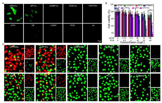 Next, we studied the killing effect of the UPH nanomaterial on tumor cells in vitro. As shown in Figure 3B, the control samples (UCNP and PCN) had little toxicity to cancer cells regardless of irradiation or not even at high doses, due to almost no ROS production. Moreover, since there was no external laser to activate the photodynamic therapy, the cell viability of the SCC-7 cells was high in the UPH and UP group, indicating the good biocompatibility of the samples. In contrast, cells treated with UP under 980nm laser showed higher death rates. This tumor-killing effect was further enhanced by coating with HA. We could find a concentration-dependent cytotoxicity in the UPH + hv group, only 37.9% of cell viability at the highest concentration. Such an excellent antitumor effect of the UPH + hv treatment was confirmed by live–dead cell staining experiments. In Figure 3C, in agreement with the cytotoxicity data, the ratio of live to dead cells (green/red fluorescence) was highest in the presence of 980 nm radiation for the cells treated with UPH in all treatment groups.