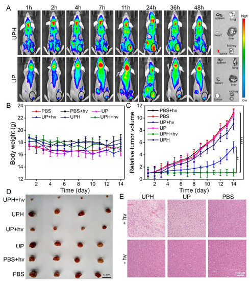 Once the tumors reached an approximate size of 100 mm3, SCC-7 tumor-bearing mice were randomized to six groups. Then, the mice were intravenously injected with various samples (150 µL), including PBS buffer, UP, and UPH. One of the two groups with PBS treatment was subjected to irradiation with a 980 nm laser at a power of 300 mW/cm2 for 10 min after 24 h, as were the mice injected with UP and UPH. The tumor volume and weight were recorded every day. The tumor volume was calculated based on the formula: a × b2/2, in which a and b refers to the length and width of tumor, respectively. After 14 days, the mice were sacrificed and anatomized to obtain the organs and tumor for histological analysis.