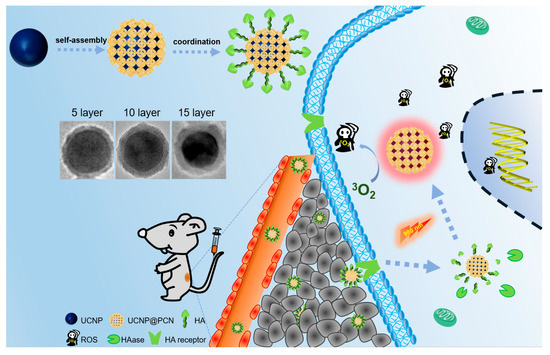 The following supporting information can be downloaded at: https://www.mdpi.com/article/10.3390/pharmaceutics15030940/s1. Figure S1. Electron microscope images of PCN nanoparticles by SEM and TEM. Figure S2. Zeta potential of different nanoparticles by DLS. Charge reversal of nanoparticles indicates successful encapsulation of PCN nanoparticles. Figure S3. PXRD pattern of different nanoparticles. The characteristic peak of PCN increases with increasing thickness of PCN layer. Figure S4. Images of different nanoparticles before and after 980 nm laser irradiation. Figure S5. (A) Size and (B) zeta potential of UP and UPH nanoparticles by DLS. Table S1. Comparison of the properties of nanoparticles with different thicknesses. Figure S6. Infrared spectrum of different samples. The red circles represent the characteristic peaks of HA. Figure S7. Size of UPH nanoparticles in PBS buffer over time. Figure S8. ROS yield of UPH nanoparticles with/without HAase. Figure S9. Statistical analysis data of cellular ROS fluorescence by CLSM. **** p < 0.0001. Figure S10. H&E staining analysis of main organs after different treatments for evaluation of biocompatibility.