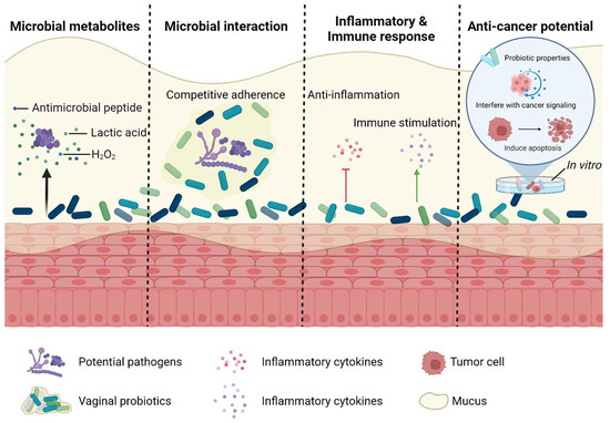 Potential roles of vaginal probiotics in ovarian cancer adjuvant therapy. Firstly, vaginal probiotics can produce defense factors to maintain a general vaginal environment. Secondly, vaginal probiotics can interact with potential pathogens and rescue microbial dysbiosis. Thirdly, vaginal probiotics can regulate the host inflammatory and immune response. Fourthly, in the in vitro experiment, some bacterial strains manifest probiotic properties and anti-cancer potentials, which might pose apoptotic effects on cancer cells or interfere with the cancer signaling. Created with BioRender.com.
