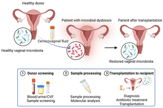 Schematic depiction of VMT. Firstly, donors are recruited and screened including analysis on blood, cervicovaginal fluid (CVF) and urine samples. Secondly, CVF samples are collected from donors and processed. Thirdly, CVF with healthy vaginal microbiota is transplanted into the vagina of recipients to restore the normal vaginal microbiota and rescue the normal function. Created with BioRender.com.