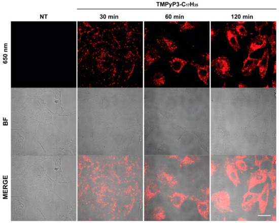 Internalization of TMPyP3-C17H35 in Vero cells. Vero cells were mock treated or treated with 21 µM TMPyP3-C17H35 for indicated periods of time and analyzed by confocal laser scanning microscopy. Scale bar, 20 µm. Upper panel emission at 650 nM. BF-bright filed.