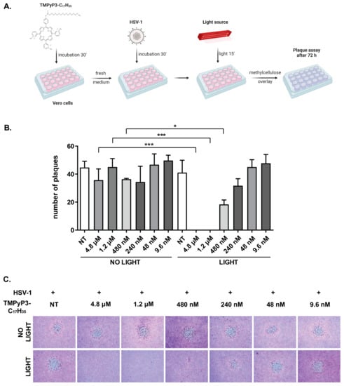 Photodynamic therapy (PDT) is a treatment that uses a nontoxic photosensitizer (PS) that can be activated by a specific wavelength of light, usually from a laser or light-emitting diode (LED), to generate reactive oxygen species (ROS) and destroy cancerous cells or inactivate pathogens. Photosensitizers (PSs) in photodynamic antimicrobial chemotherapy (PACT) are rapidly developing and have been applied to inactivate and inhibit the replication of protozoa, fungi, bacteria, and viruses [1,2,3,4,5,6,7,8]. Viruses are the most diverse biological entities, and light-activated compounds that have been shown to be effective against some viruses may be ineffective against others. The exact molecular mechanism of viral inactivation by PACT is highly dependent on the PS applied, but these mechanisms are generally rather poorly investigated and largely limited to cytotoxic studies and viral yield reduction. Several studies have shown that enveloped viruses are more susceptible to PACT than nonenveloped viruses, indicating that the viral envelope is the primary target for PSs. Other mechanisms include direct damage to the genomic material and proteins of the virus, limiting the infectivity of the virus and its capacity to replicate [2,9,10,11,12]. On the other hand, the application of a PS can lead to compromised integrity of the infected cell, immune stimulation, and/or induction of a non-permissive state for viral replication [13,14]. Currently, little is known about antiviral mechanisms triggered by nontoxic levels of PS compounds [14]. Herpes simplex virus 1 (HSV-1) is an important human pathogen and is frequently used as a model in preclinical and clinical studies of antiviral PACT [2,15,16]. HSV-1 can cause a variety of different diseases, from clinically minor and self-limiting cold sores to life-threatening encephalitis, and it is a common cause of corneal disease and the leading infectious cause of ocular morbidity and blindness [17,18]. The currently available treatments against productive HSV-1 infections largely rely on nucleoside/nucleotide analogs such as acyclovir or its derivatives and viral DNA polymerase inhibitors (i.e., foscarnet) [19]. However, the use of target-based compounds ultimately leads to the emergence of resistant mutants, which significantly hinders future successful treatments, especially in immunocompromised patients and hematopoietic stem cell recipients [20,21,22,23,24]. Thus, there is an urgent need for the development of novel drugs and alternative approaches to treat the disease, and in particular, approaches in which the virus has limited possibilities to develop resistance, such as PACT. Indeed, the benefits of photodynamic therapy have already been demonstrated for the treatment of herpes labialis [25] and herpetic keratitis [26]. We have recently shown that TMPyP3-C17H35 (Figure 1), a tricationic porphyrin-based PS with a long alkyl chain, synthesized in our laboratory [27], effectively inhibits Legionella pneumophila, an environmental bacterium and an opportunistic pathogen that causes Legionnaires’ disease [28,29]. Compared to other tested PSs, the compound showed superior properties in blocking L. pneumophila replication and biofilm formation, indicating a potential application in disinfection [29]. The main aim of this study was to determine the potential of TMPyP3-C17H35 to inhibit the replication of HSV-1, which could promote the development of new PACT-based therapies against viral infections. We used TMPyP3-C17H35 and HSV-1 to investigate the mechanisms by which tricationic amphiphilic porphyrin-based compounds with long alkyl chains inhibit viral infection. We found that the compound was very effective in reducing the infectivity of free virus and inhibiting its replication at nM concentrations.