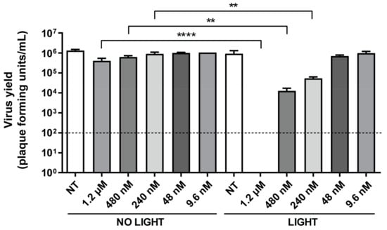 Light-activated TMPyP3-C17H35 inhibits HSV-1 infection at nM concentrations. Vero cells were infected after treatment with TMPyP3-C17H35 at concentrations between 9.6 nM and 1.2 µM, with or without irradiation. After 18 h of infection, supernatants were collected and the number of plaque-forming units (Pfu) determined by titration. NT: not treated. All samples were tested in triplicate, and data were analyzed using unpaired t-test (p values indicate significant differences; **** p = 0.0001, ** p = 0.0048). Dashed line in the graph represents detection limit of the experiment of 100 Pfu/mL.