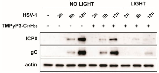 TMPyP3-C17H35 reduces levels of immediate early and late proteins. Vero cells were pretreated with 1.2 µM concentration of TMPyP3-C17H35, infected with MOI 1, and TMPyP3-C17H35 activated or not activated with light. Samples were collected at 2 h, 8 h, and 12 h post infection and probed by immunoblotting with antibodies against viral immediate–early protein ICPO and late protein gC.