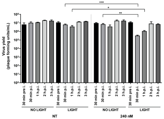 In addition, we observed no inhibitory effect on viral replication when cells were treated and exposed to light prior to infection (240 nM), indicating that the compound at nontoxic concentrations does not induce antiviral mechanisms that may limit infection (Figure 7).