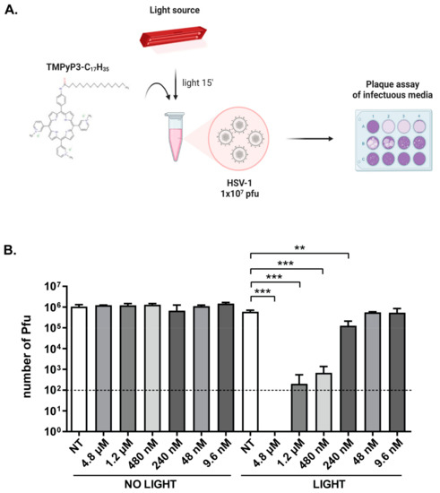 Direct effect of TMPyP3-C17H35 on HSV-1 virions. A suspension of HSV-1 (~1 × 106 virions) was treated with TMPyP3-C17H35 at final concentrations of 4.8 μM, 1.2 μM, 480 nM, 240 nM, 48 nM, or 9.6 nM, and exposed to a light source. (A) Schematic representation of the experiment. (B) The number of plaque-forming units in sample was determined by plaque assay. All samples were tested in triplicate, and data were analyzed using unpaired t-test (p values indicate significant differences; *** p = 0.0008, ** p = 0.0046). The dashed line in the graph represents the detection limit of the experiment (100 Pfu/mL).