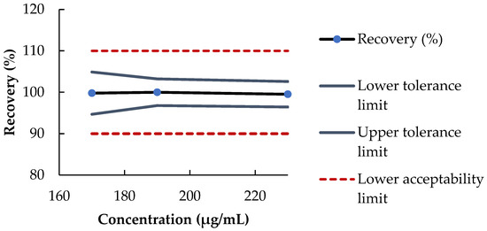 Met calibration curve was linear between 160 µg/mL and 240 µg/mL (Table 2) (y = 0.294 (±0.004)x − 1.841 (±1.270); r2 = 0.994). The Met retention time was ~6.5 min. Selectivity was assessed (no peak deformation or change in UV spectra in the presence of excipients) and no matrix effect was demonstrated. As shown in Table 3, Met assay precision was ≤1.55% and accuracy was no less than 98% for all Met concentration tested, and the repeatability was 0.6% (n = 10). In addition, the accuracy profile was within the acceptability limits of 10% (Figure 2). The LOD and LOQ were 14 µg/mL and 42 µg/mL, respectively, which was acceptable for the concentration range measured.
