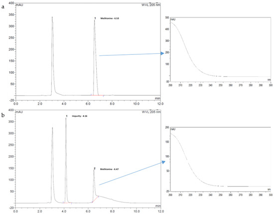 (a) Chromatogram of methionine suspension in 1 M HCl less than 15 min after mixing (Met retention time ~6.5 min); (b) Chromatogram of methionine suspension in 1 M HCl after 72 h at 70 °C with a degradation product detected at 4.2 min. Insert on the right panel pointed by an arrow: UV spectra of the 6.5 min eluted peak with x axis: wavelength (200–300 nm) and absorbance response y axis (mAU).