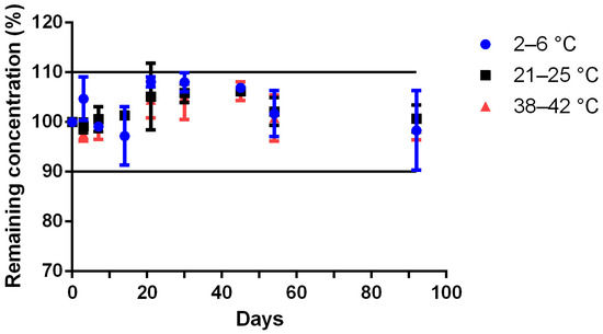 Stability over time of methionine formulated powder at 4 ± 2 °C (blue circle), 23 ± 2 °C (black square), 40 ± 2 °C (red triangle) in glass pharmaceutical bottles and over time. Remaining methionine concentration, calculated by the ratio of the concentration on the tested day to the concentration at day 0; values are mean ± SD (n = 3).