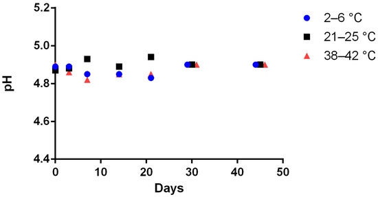 pH value of the reconstituted Methionine 200 mg/mL formulated suspension stored at 4 ± 2 °C (blue circle), 23 ± 2 °C (black square), 40 ± 2 °C (red triangle) in glass pharmaceutical bottles and over time (for more visibility the points have been shifted for days 30 and days 45; standard deviation bars are not visible on the figure due to low data scatter; n =3).