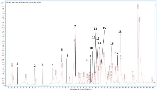 The HPLC–ESI-QTOF-MS/MS total ion current chromatogram of the 70% (v/v) methanolic extracts from flowering herbs of M. bradburiana: 1. gallic acid, 2. protocatechuic acid, 3. hydroxybenzoic acid glucoside, 4. p-OH-benzoic acid, 5. chlorogenic acid, 6. coumarylquinic acid, 7. p-coumaric acid, 8. kaempherol-3-rutinoside, 9. luteolin-7-glucoside, 10. naringin, 11. ferulic acid, 12. apigenin-7- rutinoside, 13. apigenin-7-glucoside, 14. luteolin-3-glucuronide 15. rosmarinic acid, 16. luteolin, 17. naringenin, 18. apigenin.