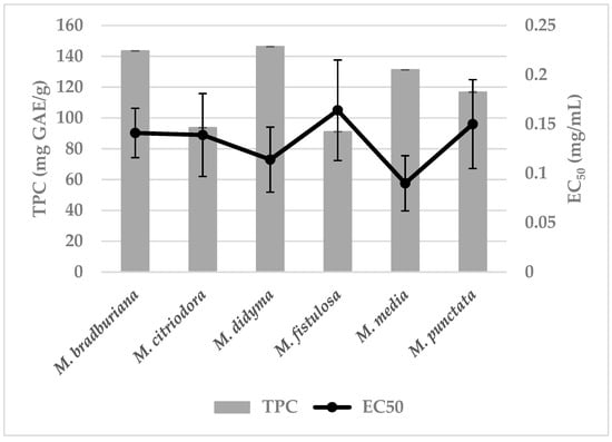The total polyphenol content (TPC) calculated as gallic acid equivalents (GAE) in 70% (v/v) methanolic extracts of Monarda species, together with their antioxidant activity (EC50 value). Mean values ± SD were presented (n = 3).