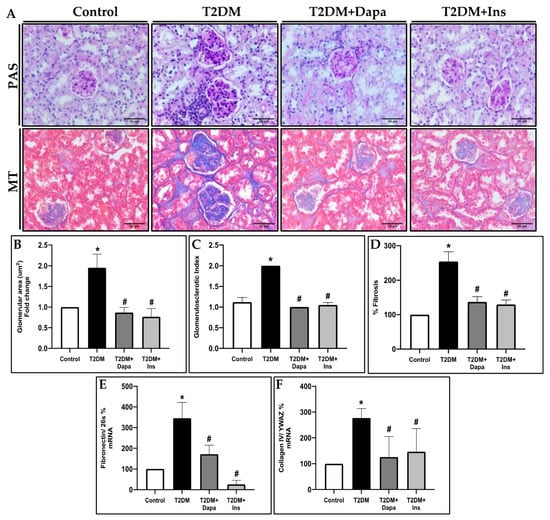 Treatment with dapagliflozin attenuates diabetes–renal fibrosis and ameliorates glomerular injury in T2DM mice. (A) Representative images for Masson’s Trichrome (MT) and periodic acid-Schiff (PAS) stains. (B) Quantification of the glomerular area and (C) glomerulosclerosis index assessed using PAS-stained sections. (D) Quantification of the MT-positive percentage reflecting fibrosis. mRNA levels of (E) Fibronectin and (F) Collagen IV calculated as percentage using the 2−(ΔΔCt) method. Data represent the mean ± SD of 4 mice per group. * p < 0.05 relative to the control group; # p < 0.05 relative to the untreated diabetic mice group.