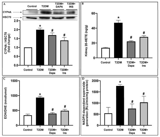 Dapagliflozin prevents the overproduction of 20-HETE, downregulates CYP4A protein expression, and attenuates ROS generation and NADPH oxidase activity in type 2 diabetic mice. (A) Representative Western blots showing the expression of CYP4A and CYP4A/HSC70 quantification presented as fold change. (B) Histograms representing 20-HETE formation measured in the renal cortex of the different groups of mice. (C) HPLC analysis and quantification of EOH/DHE ratios (nmol/umol), and (D) NADPH-dependent superoxide generation (RLU/min/mg protein) measured in the renal cortex of the different groups of mice. Data represent the mean ± SD of 4 mice per group. * p < 0.05 relative to the control group; # p < 0.05 relative to the untreated diabetic mice group.
