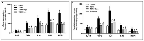 Inflammation has been described to play a role in the development of DKD through the increased cytokine production and exacerbation of oxidative stress [39]. The expression profiles of the essential proinflammatory cytokines and chemokines, MCP-1, IL-1β, IL-6, IL-17, and TNFα, were significantly increased in plasma and kidney cortices of the untreated diabetic mice when compared to their control littermates (Figure 3A,B). Interestingly, the observed increase in the inflammatory mediators was attenuated when the diabetic mice were treated with dapagliflozin or insulin (Figure 3A,B).
