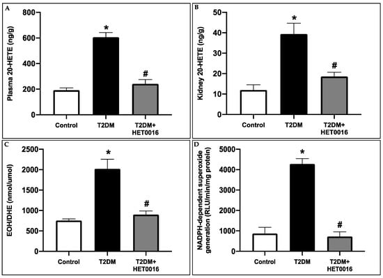 In these set of experiments, we used control and type 2 diabetic FVB/NJ mice to assess whether the observed diabetes-induced renal changes are reproducible across strains. Furthermore, these experiments will allow us to determine whether the inhibition of 20-HETE plays a central role in the pathogenesis of diabetes-induced renal damage. By utilizing multiple strains of mice and examining the impact of 20-HETE inhibition on renal function and structure, this study will allow us to gain a more comprehensive understanding of the mechanisms underlying diabetic kidney disease. As expected, the 20-HETE production was significantly higher in the plasma and kidneys of untreated type 2 diabetic mice as compared to the controls. This was prevented or reduced in the diabetic animals treated with HET0016, a potent inhibitor of CYP4A and therefore of 20-HETE production (Figure 4A,B). The elevated 20-HETE levels correlated with an overproduction of ROS as determined by HPLC, which was paralleled by an increase in NADPH oxidase enzymatic activity in the untreated diabetic mice compared to control mice. This increase was inhibited in the diabetic mice after HET0016 treatment (Figure 4C,D).