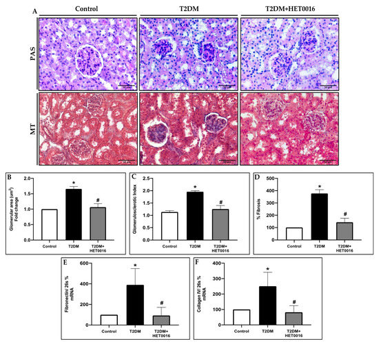 20-HETE production mediates diabetes-induced renal fibrosis and glomerular injury in T2DM mice. (A) Representative images for Masson’s Trichrome (MT) and periodic acid-Schiff (PAS) stains. (B) Quantification of the glomerular area and (C) glomerulosclerosis index assessed using PAS-stained sections. (D) Quantification of the MT-positive percentage reflecting fibrosis. mRNA levels of (E) Fibronectin and (F) Collagen IV calculated as percentage using the 2−(ΔΔCt) method. Data represent the mean ± SD of 5 mice per group. * p < 0.05 relative to the control group; # p < 0.05 relative to the untreated diabetic mice group.