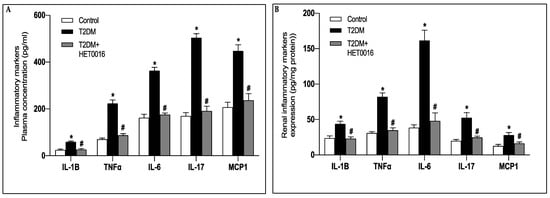 The anti-inflammatory effect of inhibiting CYP4A/20-HETE in DKD was assessed by measuring MCP-1, IL-1β, IL-6, IL-17, and TNF⍺ in the plasma (Figure 6A) and the kidney cortices (Figure 6B) of the different groups of mice. Our results demonstrate that the inhibition of 20-HETE production by HET0016 results in a significant reduction in the measured proinflammatory markers observed in the T2DM mice (Figure 6A,B).