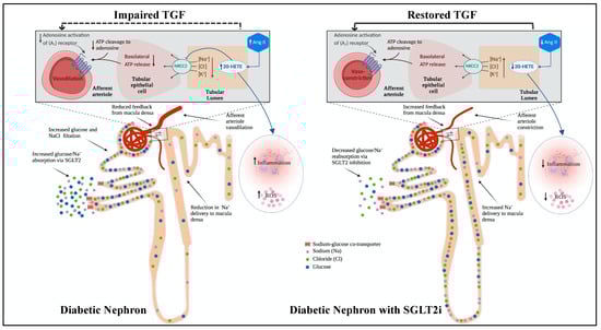 Proposed renoprotective mechanism of sodium/glucose co-transporter 2 (SGLT2) inhibition on diabetic nephron. In diabetic kidney, the overexpression and increased activity of SGLT2 on glucose and sodium reabsorption in the proximal convoluted tubule leads to decreased delivery of solutes to the macula densa. This aberrant transport into the tubular epithelial cells results in reduction in the adenosine triphosphate (ATP) release from the basolateral membrane and limits its conversion to adenosine. On the other hand, increased 20-HETE renal synthesis associated with diabetes and increased Angiotensin II (Ang II) production also inhibits the apical Na+-K+-2Cl− (NKCC2) cotransporter, which is responsible for NaCl uptake in the macula densa cells. Consequently, reduced activation of A1 adenosine receptor expressed in the afferent arteriole leads to vasodilation and impaired tubuloglomerular feedback (TGF). After treatment with SGLT2 inhibitor, the solute delivery to the macula densa is increased in the diabetic nephron, and decreased Ang II and 20-HETE production reverses the NKCC2 inhibition. Therefore, the basolateral release of ATP from the tubular epithelium is increased. This in turn will restore adenosine activation of the A1 receptor resulting in vasoconstriction of the afferent arteriole. At the same time, 20-HETE inhibition attenuates reactive oxygen species (ROS) production and inflammation associated with diabetic kidney disease.