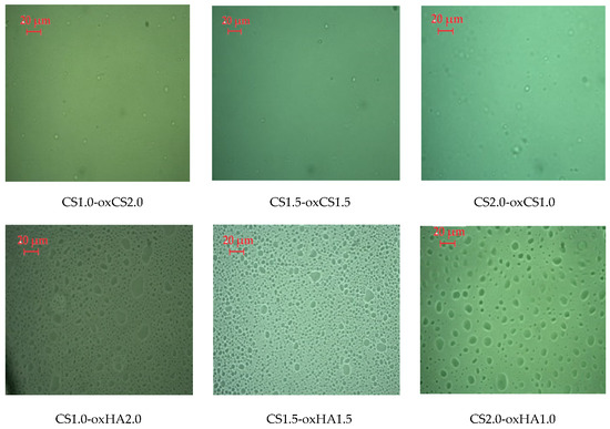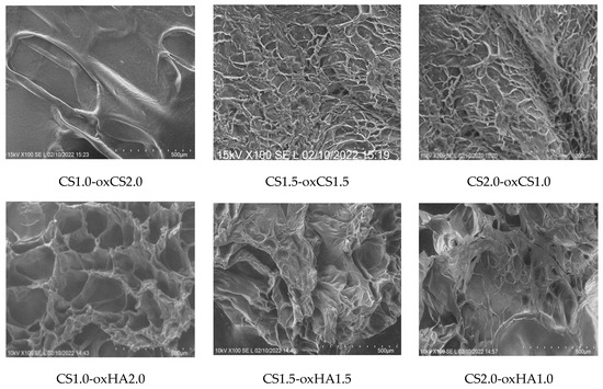As expected, CS1.0-oxHAox2.0, containing 2% oxHA, shows the quasiuniform distribution of 100–300 µm pores, while CS1.5-oxHA1.5 (1.5% oxHA) and CS2.0-oxHA1.0 (1.0% oxHA) revealed a less uniform defined pores. This is explained by a reduced number of carbonyl groups available for Schiff base imino interactions when the concentration of oxHA decreases.