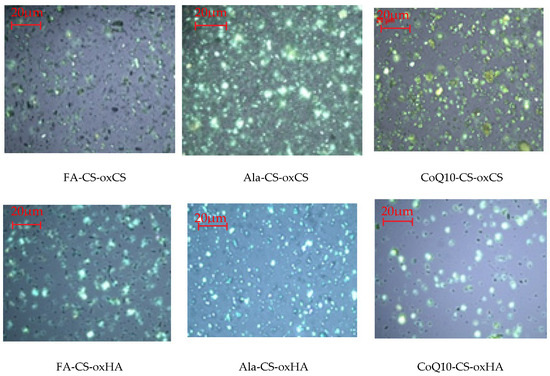 The macroscopic aspect of API-CS-oxCS/oxHA based hydrogels is dependent on API embedded in a 3D polymer matrix, slightly white for Ala-CS-oxCS/oxHA, white to slightly yellow for FA-CS-oxCS/oxHA, and yellow for CoQ10-CS-oxCS/oxHA. After preparation, the API-CS-based hydrogels were stored at 2–8 °C.
