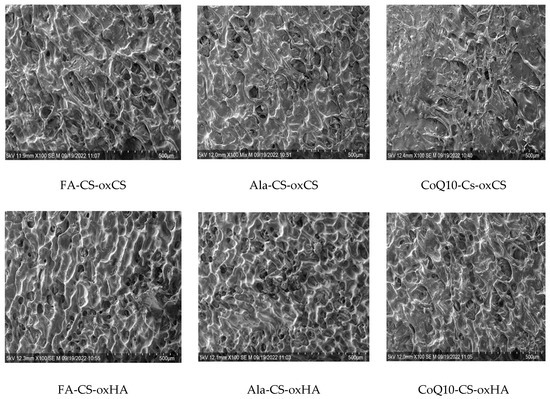 The morphology of APIs-CS-based hydrogels is similar to corresponding CS-oxCS/oxHA with relatively a uniform distribution of pores and homogenous dispersion of APIs (Figure 5).