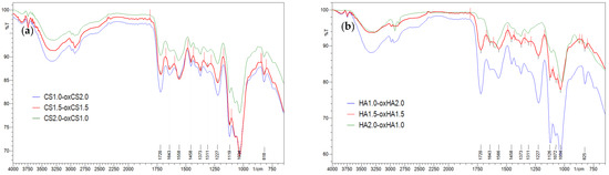 On the FA-CS-oxCS/oxHA spectra (Figure 7a,b), more broad and intense peaks were observed, compared with CS-oxCS/oxHA spectra. These differences are explained by the addition of the stretching vibrations and overlapping of signals of functional groups as O-H (3550–3200 cm−1), C=O from COOH (around 1750 cm−1), double bonds C=C (1620–1560 cm−1), and C-O bonds (around 1100 cm−1) from both the FA and polysaccharide backbone of CS, oxCS, and oxHA [79].