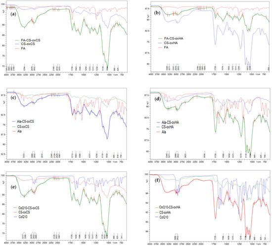 FT-IR spectra of API-CS-oxCS/oxHA hydrogels: (a) FA-CS-oxCS vs. CS-oxCS and FA; (b) FA-CS-oxHA vs. CS-oxHA and FA; (c) Ala-CS-oxCS vs. CS-oxCS and Ala; (d) Ala-CS-oxHA vs. CS-oxHA and Ala; (e) CoQ10-CS-oxCS vs. CS-oxCS and CoQ10: (f) CoQ10-CS-oxHA vs. CS-oxHA and CoQ10.