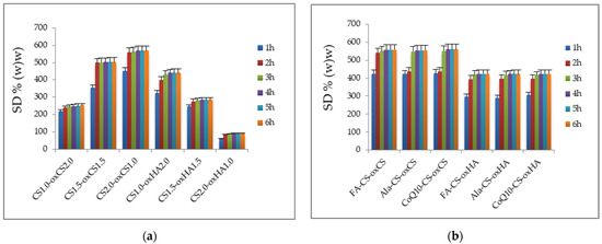 For all samples, around 70% from the entire value of SD was recorded after 1 h at the start of the experiment (Figure 8). The maximum value of SD was achieved after 3 h for CS-oxHA, and after 4 h for CS-oxCS, respectively (Figure 8a). Although the SD for CS-oxCS was higher (up to 568%) than CS-oxHA (up to 440%), the hydration rate was similar for both types of hydrogels.