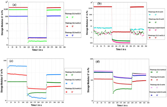 The test consists in three stages: in the first one, very small deformation forces are applied (within the LVE range determined in the amplitudes sweep test) to simulate the hydrogel behavior at resting conditions. In the second step, the sample is subjected to high shear—very high deformation forces (outside the LVE) in order to simulate the breakdown of the sample. In the last stage, the minimum shear is returned with very small deformation forces to simulate the recovery of the structure [71,72]. At the end of the test, the samples recover their structure in variable percentages depending on the intrinsic physical properties. The set parameters are presented in Table 4.