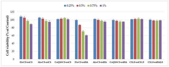 The cytotoxicity degree of CS-oxCS/oxHA and API-CS-oxCS/oxHA was assessed by an MTS assay using the CellTiter 96®AQueous One Solution Cell Proliferation Assay (Promega, Madison, WI USA), according to the manufacturers’ instructions and extract dilution method [73]). For this purpose, the hydrogel samples’ extracts were done in a complete cell culture medium at 1% (v/v), for 24 h at 37 °C. Human gingival fibroblasts were seeded at 0.4 × 105 cells/mL into 96-well tissue culture-treated plates in an MEMα medium with 10% fetal bovine serum and 1% penicillin–streptomycin–amphotericin B mixture. The next day, the cells were incubated in triplicate for 72 h with different concentrations (v/v) of hydrogel samples’ extracts (0.25%, 0.5%, 0.75%, and 1%). MTS reagent was added and absorbance readings were done 3 h later at 490 nm on a FLUOstar® Omega microplate reader (BMG LABTECH, Ortenberg, Germany). Cell viability was expressed as a percentage of the control cells’ viability (means ± SD).