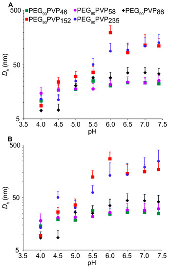 When the pH of the micellar solutions was decreased, a gradual decline in Dh was observed at pH 6.0–5.5, which correlates to protonation/ionisation of the PVP block as the pH approaches the pKa of VP (pKa ~5) and previously reported pKa values for PEG-b-PVP copolymers [12,13,17]. Protonation of the PVP block would be expected to cause micelle swelling, reorganisation, and disassembly, until unimers are observed at a sufficiently low pH. For the higher fPVP copolymers (i.e., PEG90PVP152 and PEG90PVP235), disassembly was preceded by a slight increase in Dh at pH 6.0. This is likely due to the presence of partially protonated, and electrostatically repulsive PVP blocks at the perimeter of the micelle core, hindering the steric stabilisation afforded by the PEG blocks and causing swelling and an increase in micelle size. This observation is consistent with previously reported results for micelles containing PVP [7,12,13,17]. The same trend is not observed for copolymers with fPVP < 0.68 (i.e., PEG90PVP46, PEG90PVP58, and PEG90PVP86), ostensibly due to the greater stability conferred by PEG in these micelles where a larger weight fraction of PEG exists. Regardless, further reduction in pH (and protonation of the PVP blocks) afforded an apparent disassembly of the micelles into smaller aggregates or unimers for all the studied copolymers (Table S2).