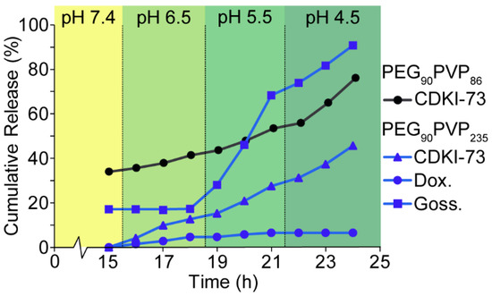 pH-dependent cumulative release plots for the PEG90PVP86 and PEG90PVP235 copolymers following the encapsulation of hydrophobic drugs CDKI-73, doxorubicin, or gossypol. Drug-loaded micellar solutions of concentration 1 mg·mL−1 were used for all experiments, with a drug loading of 10 wt%.
