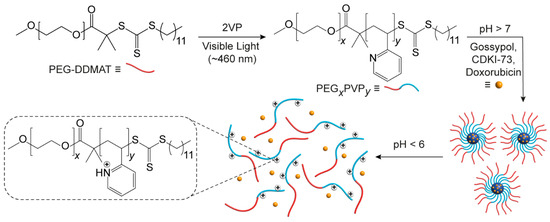 Preparation of PEG-b-PVP copolymers via the photo-RAFT of 2-vinylpyridine from the PEG-DDMAT macroinitiator, and the pH-mediated formation and disassembly of their drug-loaded micelles.