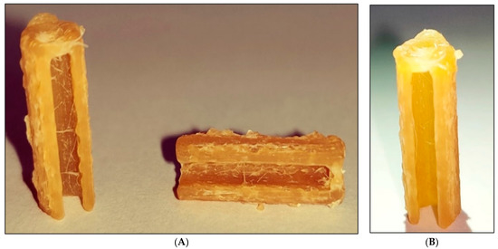 Fused filament fabricated 3D sorbent. (A) Raw sorbent before activation, vertical and horizontal view, and (B) rinsed sorbent after activation.