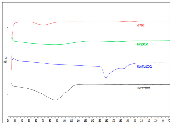 Over laid DSC thermograms of AffinisolTM (HPMC HME 15 LV), raw sorbent, polyvinyl alcohol and rinsed sorbent.