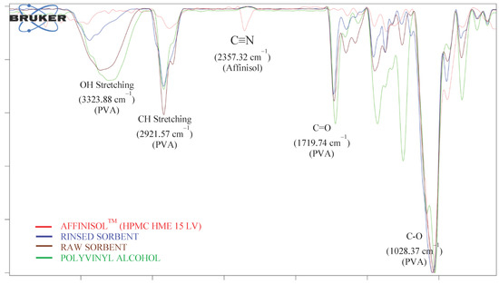 Overlaid ATR-FTIR spectra of Affinisol™ (HPMC HME 15 LV), rinsed sorbent, raw sorbent and polyvinyl alcohol.