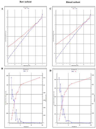 Characterization of the mesoporous structure of raw sorbent (A,B) and rinsed sorbent (C,D). BET isotherms of raw sorbent (A) and rinsed sorbent (C). Cumulative pore volume distribution of both (B) raw sorbent and (D) rinsed sorbent. The pore volume indicates the total volume of the pores at a specific diameter, in cc/g as evaluated from BET measurements.