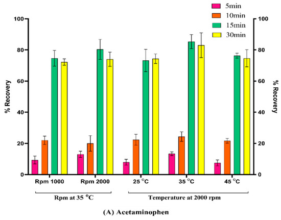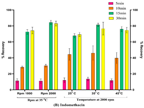 Optimization of extraction recovery of (A) acetaminophen and (B) indomethacin by using RPM and temperature.