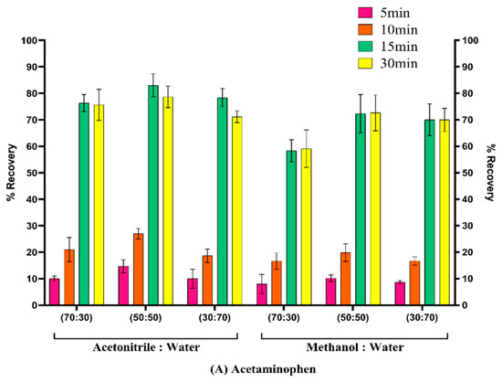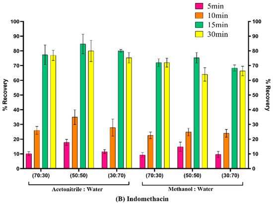 Optimization of extraction recovery of (A) acetaminophen and (B) indomethacin by using solvents acetonitrile: water (70:30, 50:50, 30:70) and methanol: water (70:30, 50:50, 30:70).